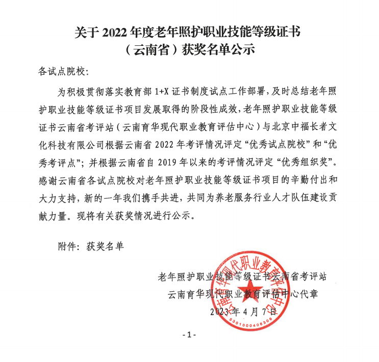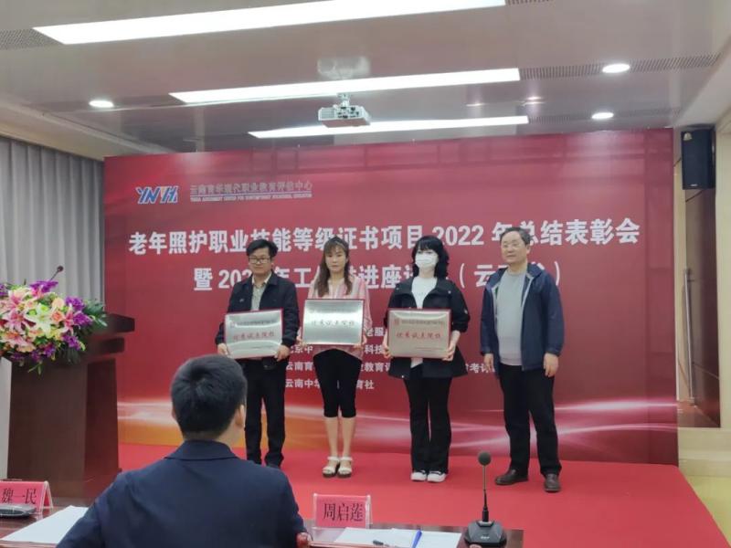 为进一步贯彻落实教育部“1+X”证书试点工作部署,及时总结老年照护职业技能等级证书项目发展取得的阶段性成效,老年照护职业技能等级证书项目2022年总结表彰会暨2023年工作推进会(云南省)2023年4月16日在昆明顺利召开,会上对先进集体进行了表彰。根据云南省2022年老年照护职业技能等级证书考评情况,新葡萄奔驰AMG官网被云南省考评站(云南育华现代职业教育评估中心)与北京中福长者文化科技有限公司综合评定为“优秀试点院校”称号。中国社会福利与养老服务协会、北京中福长者文化科技有限公司副总经理、首席技术官魏一民为学校颁奖授牌。